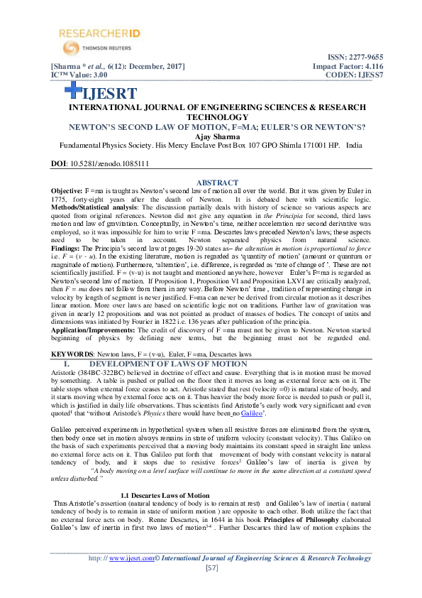Pdf Newton S Second Law Of Motion F Ma Euler S Or Newton S Ajay Sharma Academia Edu